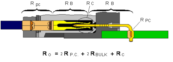 在该方程中,r是导体的电阻率(也可以是连接器中弹簧材料),“l”是导体的长度,而“a”是导体的横截面积(或连接器中弹簧的几何形状)。对于给定的材料,例如磷青铜和接触几何形状,这些参数是常数,因此连接器的整体电阻是恒定的。